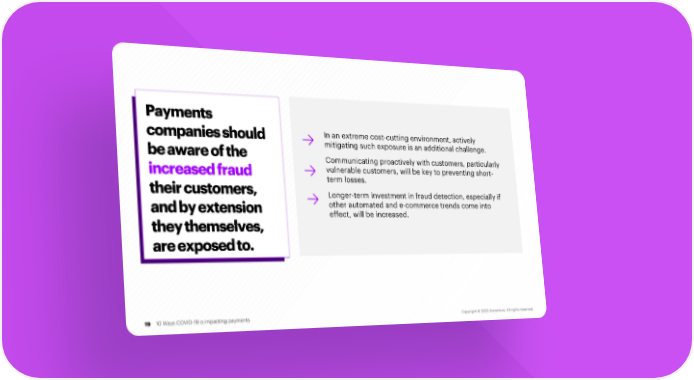 Payments companies should In an extreme cost-cutting environment, actively be aware of the mitigating such exposure is an additional challenge. Communicating proactively with customers, particularly increased fraud vulnerable customers, will be key to preventing short- their customers, term losses. Longer-term investment in fraud detection, especially if and by extension other automated and e-commerce trends come into they themselves, effect, will be increased. are exposed to. 19 10 Ways COVID-19 is impacting payments