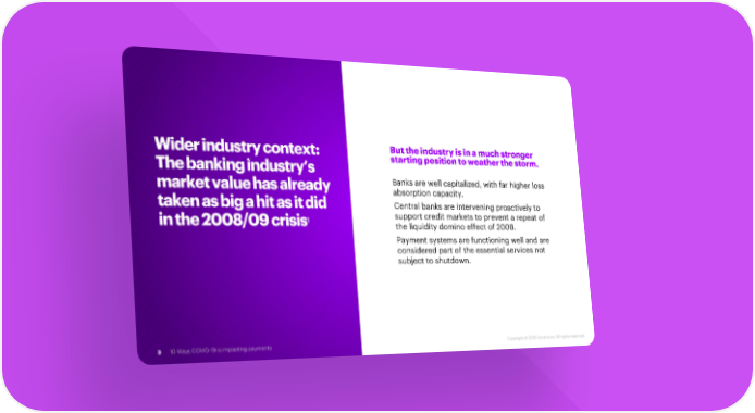 Wider industry context: But the industry is in a much stronger starting position to weather the storm. The banking industry’s market value has already Banks are well capitalized, with far higher loss absorption capacity. taken as big a hit as it did Central banks are intervening proactively to 1 support credit markets to prevent a repeat of in the 2008/09 crisis the liquidity domino effect of 2008. Payment systems are functioning well and are considered part of the essential services not subject to shutdown. 3 10 Ways COVID-19 is impacting payments