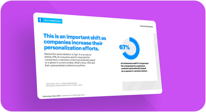 The I in Experience #TECHVISION2020 This is an important shift as companies increase their personalization efforts. Demand for personalization is high. In a survey by Adobe, 67%of consumers said it’s important for companies to customize content automatically based on a person’s current context. What’s more, 42% said that unpersonalizedcontent annoys them. of consumers said it’s important for companies to customize content automatically based on a person’s current context. Abramovich, G (n.d.). Consumer Demand for Personalized Content Reaches All-Time High. Adobe. Technology Vision 2020 | accenture.com/technologyvision 4