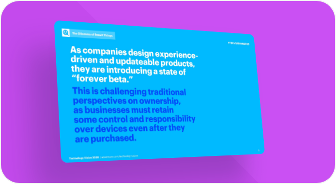 The Dilemma of Smart Things #TECHVISION2020 As companies design experience- driven and updateable products, they are introducing a state of “forever beta.” This is challenging traditional perspectives on ownership, as businesses must retain some control and responsibility over devices even after they arepurchased. Technology Vision 2020 | accenture.com/technologyvision 5