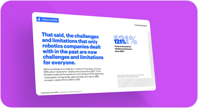 Robots in the Wild #TECHVISION2020 That said, the challenges 121% and limitations that only robotics companies dealt Jump in demand for robotics technicians with in the past are now since 2017. challenges and limitations foreveryone. Savvy businesses are investing in robotics hiring today, driving a 121% jump in demand for robotics technicians since 2017. This is followed closely by the people who will handle all of the data those robots gather and generate: data scientists, who saw an 88% Demand for Robotics and Data Experts Skyrockets. increase in demand from 2018 to 2019. (2019, May 6). Thomas Industry Update. Technology Vision 2020 | accenture.com/technologyvision 10