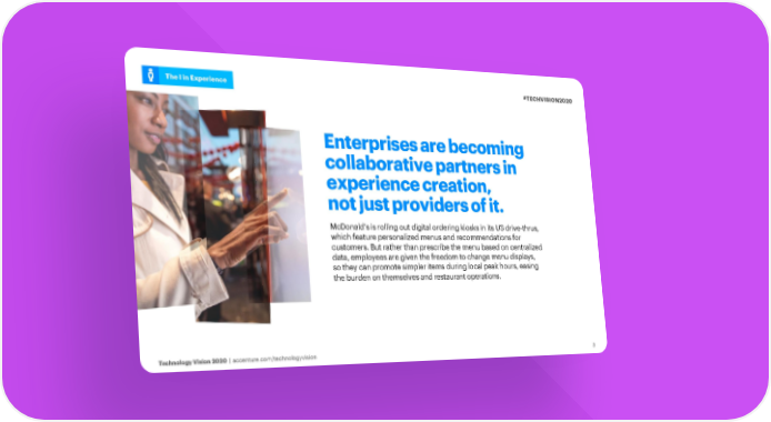 The I in Experience #TECHVISION2020 Enterprises are becoming collaborative partners in experience creation, not just providers of it. McDonald’s is rolling out digital ordering kiosks in its US drive-thrus, which feature personalized menus and recommendations for customers. But rather than prescribe the menu based on centralized data, employees are given the freedom to change menu displays, so they can promote simpler items during local peak hours, easing the burden on themselves and restaurant operations. Technology Vision 2020 | accenture.com/technologyvision 3