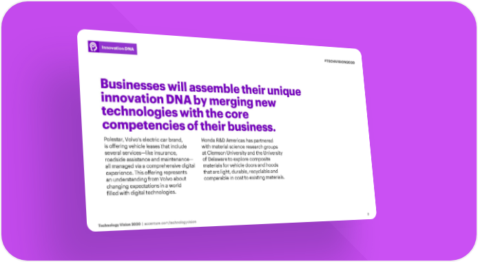 Innovation DNA #TECHVISION2020 Businesses will assemble their unique innovation DNA by mergingnew technologies with the core competencies of their business. Polestar, Volvo’s electric car brand, Honda R&D Americas has partnered is offering vehicle leases that include with material science research groups several services—like insurance, at Clemson University and the University roadside assistance and maintenance— of Delaware to explore composite all managed via a comprehensive digital materials for vehicle doors and hoods experience. This offering represents that are light, durable, recyclable and an understanding from Volvo about comparable in cost to existing materials. changing expectations in a world filled with digital technologies. Technology Vision 2020 | accenture.com/technologyvision 8