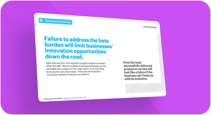 The Dilemma of Smart Things #TECHVISION2020 Failure to address the beta burden will limit businesses’ innovation opportunities down the road. Agile approaches in the engineering space started businesses Even the most down this path. Now businesses must expand that approach to successfully delivered permeate every aspect of their organization, from marketing product or service will to product to securityto sales. Those who don'twill face look like a failure if the mounting customerfrustration and attrition. business can’t keep up withits evolution. Technology Vision 2020 | accenture.com/technologyvision 8