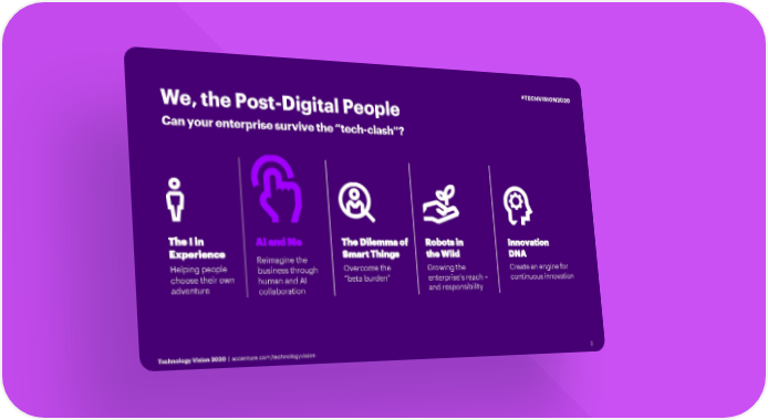 #TECHVISION2020 We, the Post-Digital People Can your enterprise survive the “tech-clash”? The I in AI and Me The Dilemma of Robots in Innovation Experience Reimagine the Smart Things the Wild DNA Helping people business through Overcome the Growing the Create an engine for choose their own human and AI “beta burden” enterprise’s reach – continuous innovation adventure collaboration and responsibility Technology Vision 2020 | accenture.com/technologyvision 2
