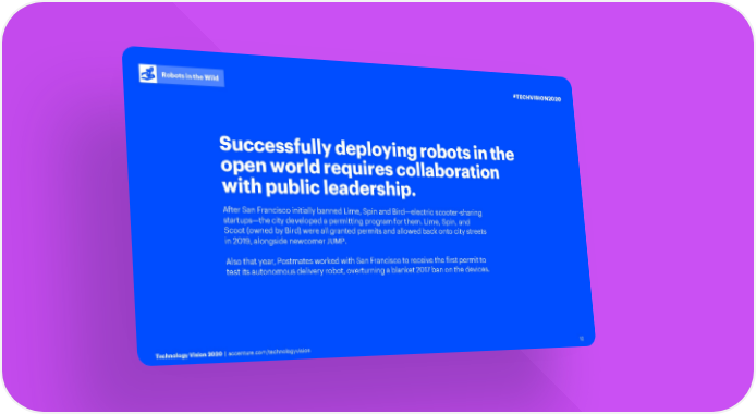 Robots in the Wild #TECHVISION2020 Successfully deploying robots in the open world requires collaboration with public leadership. After San Francisco initially banned Lime, Spin and Bird—electric scooter-sharing startups—the city developed a permitting program for them. Lime, Spin, and Scoot (owned by Bird) were all granted permits and allowed back onto city streets in 2019, alongside newcomer JUMP. Also that year, Postmates worked with San Francisco to receive the first permit to test its autonomous delivery robot, overturning a blanket 2017 ban on the devices. Technology Vision 2020 | accenture.com/technologyvision 12