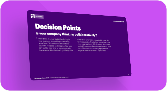 AI and ME #TECHVISION2020 Decision Points Is your company thinking collaboratively? ⎮Determine the role that AI is playing in ⎮Determine what tools are available internally your business alongside your existing to introduce the AI solutions needed to move workforce. Think beyond which tasks your organization in this direction. If none are could be replaced and imagine how you available, evaluate if employees have the skills can build a new kind of workforce with to build the solutions, or engage partners humans and AI collaborating side by side. to generate the necessary capabilities. Technology Vision 2020 | accenture.com/technologyvision 14