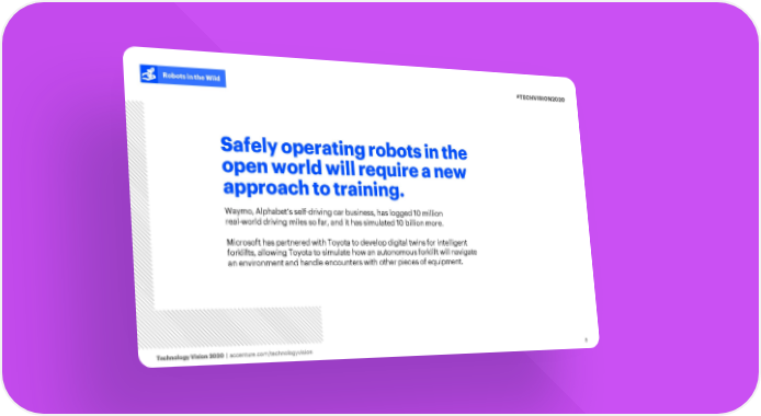 Robots in the Wild #TECHVISION2020 Safely operating robotsin the open world will require a new approach to training. Waymo, Alphabet’s self-driving car business, has logged 10 million real-world driving miles so far, and it has simulated 10 billion more. Microsoft has partnered with Toyota to develop digital twins for intelligent forklifts, allowing Toyota to simulate how an autonomous forklift will navigate an environment and handle encounters with other pieces of equipment. Technology Vision 2020 | accenture.com/technologyvision 8