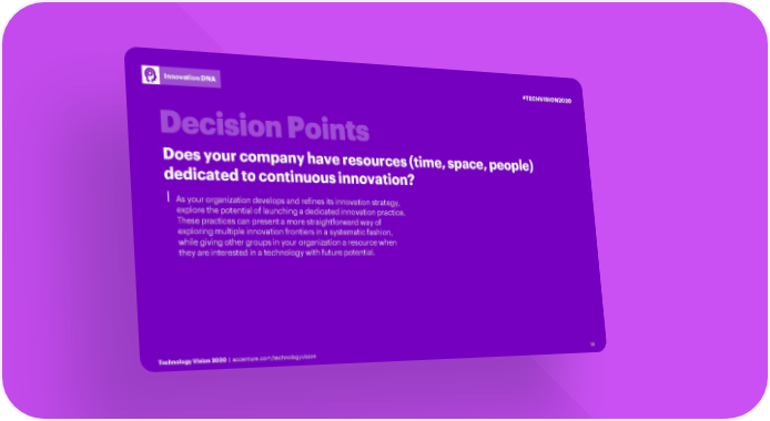 Innovation DNA #TECHVISION2020 Does your company have resources (time, space, people) dedicated to continuous innovation? ⎮As your organization develops and refines its innovation strategy, explore the potential of launching a dedicated innovation practice. These practices can present a more straightforward way of exploring multiple innovation frontiers in a systematic fashion, while giving other groups in your organization a resource when they are interested in a technology with future potential. Technology Vision 2020 | accenture.com/technologyvision 1414