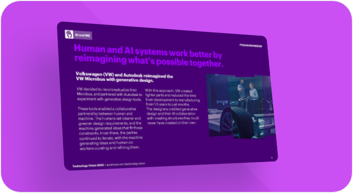 AI and ME #TECHVISION2020 Human and AI systems work better by reimagining what’s possible together. Volkswagen (VW) and Autodesk reimagined the VW Microbus with generative design. VW decided to reconceptualize their With this approach, VWcreated Microbus, andpartnered with Autodesk to lighter parts and reduced the time experiment with generative design tools. from development to manufacturing from 1.5 years to just months. These tools enabled a collaborative The designers credited generative partnership between human and design and their AI collaboration machine. The humans set cleaner and with creating structures they could greener design requirements, and the never have created on their own. machine generated ideas that fit those constraints. From there, the parties continued to iterate, with the machine generating ideas and human co- workers curating and refining them. Technology Vision 2020 | accenture.com/technologyvision 5
