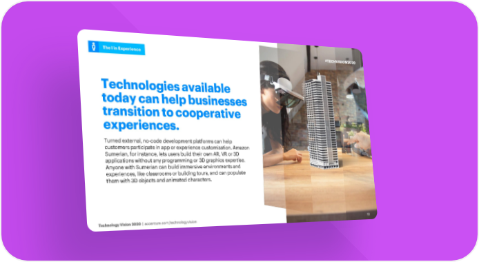The I in Experience ##TTECHVECHVISISIONION22020200 Technologies available today can help businesses transition to cooperative experiences. Turned external, no-code development platforms can help customers participate in app or experience customization. Amazon Sumerian, for instance, lets users build their own AR, VR or 3D applications without any programming or 3D graphics expertise. Anyone with Sumerian can build immersive environments and experiences, like classrooms or building tours, and can populate them with 3D objects and animated characters. Technology Vision 2020 | accenture.com/technologyvision 10