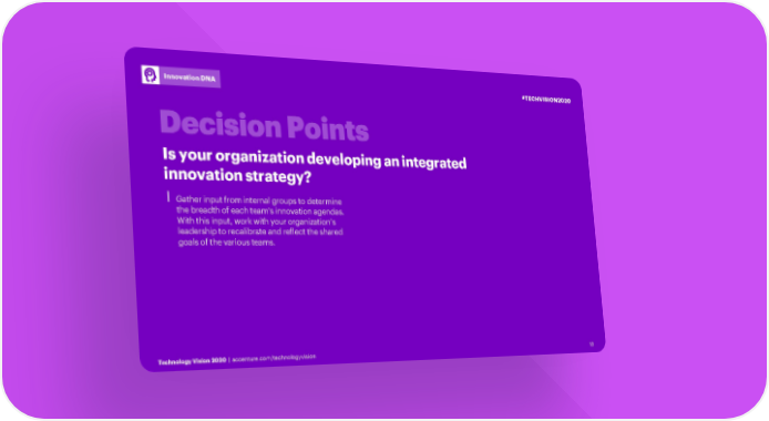 Innovation DNA #TECHVISION2020 Is your organization developing an integrated innovation strategy? ⎮Gather input from internal groups to determine the breadth of each team’s innovation agendas. With this input, work with your organization’s leadership to recalibrate and reflect the shared goals of the various teams. Technology Vision 2020 | accenture.com/technologyvision 1313