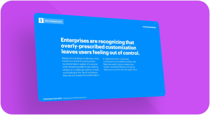 The I in Experience #TECHVISION2020 Enterprises are recognizing that overly-prescribed customization leaves users feeling out of control. Researchers at Harvard’s Berkman Klein In response to this unintended Center found that the personalized consequence, the platform added new recommendation system of a popular features explaining why viewers see video streaming platform was leading certain recommendations and giving viewers to increasingly radical content, them more control over the experience. contributing to the rise of conspiracy theories and spread of misinformation. Technology Vision 2020 | accenture.com/technologyvision 6