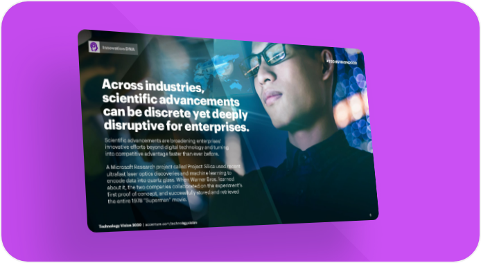 Innovation DNA #TECHVISION2020 Across industries, scientific advancements can be discrete yet deeply disruptive for enterprises. Scientific advancements are broadening enterprises’ innovative efforts beyond digital technology and turning into competitive advantage faster than ever before. A Microsoft Research project called Project Silica used recent ultrafast laser optics discoveries and machine learning to encode data into quartz glass. When Warner Bros. learned about it, the two companies collaborated on the experiment’s first proof of concept, and successfully stored and retrieved the entire 1978 “Superman” movie. TeTechchnnoolologygy VisVisioionn 22002200 | | accaccentuenturere..ccomom//tteecchhnnolooogygyvvisioisionn 6