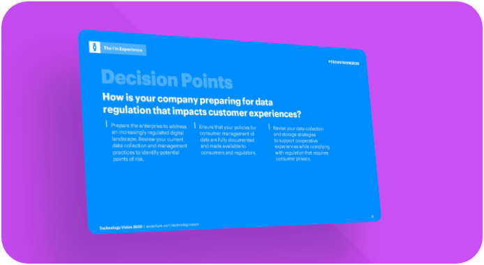 The I in Experience #TECHVISION2020 How is your company preparing for data regulation that impacts customer experiences? ⎮Prepare the enterprise to address ⎮ Ensure that your policies for ⎮Revise your data collection an increasingly regulated digital consumer management of and storage strategies landscape. Review your current data are fully documented to support cooperative data collection and management and made available to experiences while complying practices to identify potential consumers and regulators. with regulation that requires points of risk. consumer privacy. Technology Vision 2020 | accenture.com/technologyvision 15