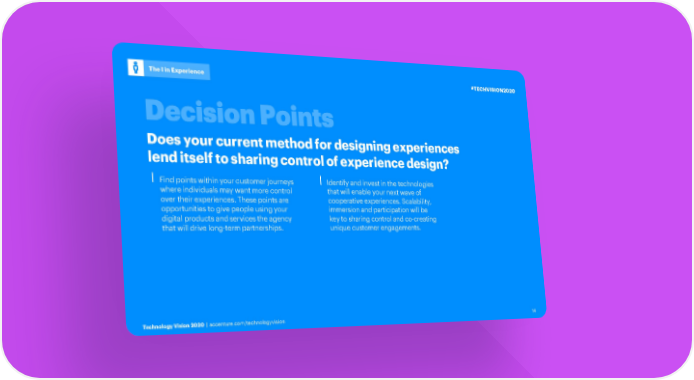 The I in Experience #TECHVISION2020 Does your current method for designing experiences lend itself to sharing control of experience design? ⎮Find points within your customer journeys ⎮Identify and invest in the technologies where individuals may want more control that will enable your next wave of over their experiences. These points are cooperative experiences. Scalability, opportunities to give people using your immersion and participation will be digital products and services the agency key to sharing control and co-creating that will drive long-term partnerships. unique customer engagements. Technology Vision 2020 | accenture.com/technologyvision 14