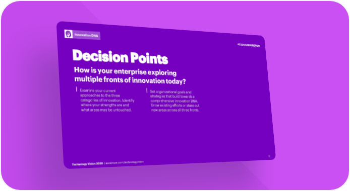 Innovation DNA #TECHVISION2020 Decision Points How is your enterprise exploring multiple fronts of innovation today? ⎮Examine your current ⎮Set organizational goals and approaches to the three strategies that build towards a categories of innovation. Identify comprehensive innovation DNA. where your strengths are and Grow existing efforts or stake out what areas may be untouched. new areas across all three fronts. Technology Vision 2020 | accenture.com/technologyvision 1212