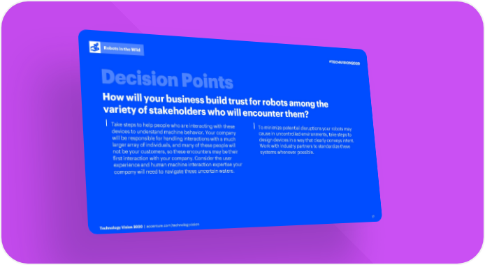 Robots in the Wild #TECHVISION2020 How will your business build trust for robots among the variety of stakeholders who will encounter them? ⎮Take steps to help people who are interacting with these ⎮To minimize potential disruptions your robots may devices to understand machine behavior. Your company cause in uncontrolled environments, take steps to will be responsible for handling interactions with a much design devices in a way that clearly conveys intent. larger array of individuals, and many of these people will Work with industry partners to standardize these not be your customers, so these encounters may be their systems whenever possible. first interaction with your company. Consider the user experience and human-machine interaction expertise your company will need to navigate these uncertain waters. Technology Vision 2020 | accenture.com/technologyvision 17