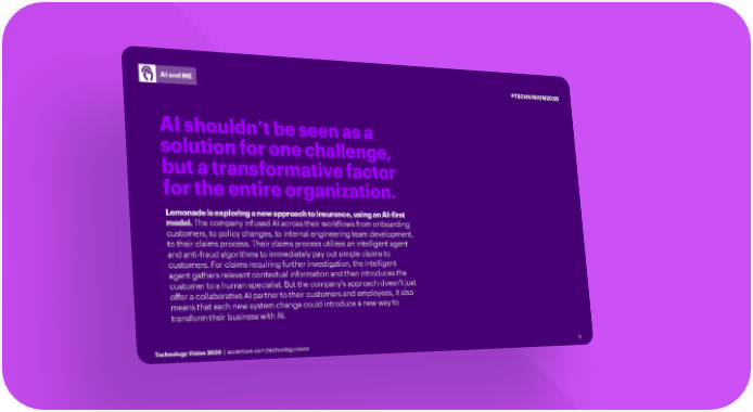 AI and ME #TECHVISION2020 AI shouldn’t be seen as a solution for one challenge, but a transformative factor for the entire organization. Lemonade is exploring a new approach to insurance, usingan AI-first model.The company infusedAI across their workflows from onboarding customers, to policy changes, to internal engineering team development, to their claims process.Their claims process utilizes an intelligent agent and anti-fraud algorithms to immediately pay out simple claims to customers. For claims requiring further investigation, the intelligent agent gathers relevant contextual information and then introduces the customer to a human specialist. But the company's approach doesn't just offer acollaborative AI partner to their customers andemployees, it also means that each new system change could introduce a new way to transform their business with AI. Technology Vision 2020 | accenture.com/technologyvision 11