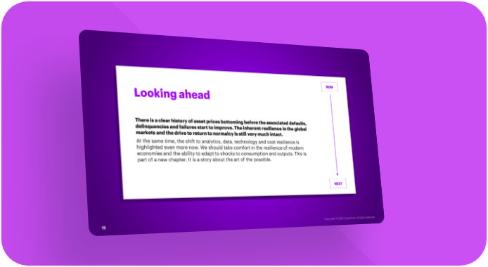 NOW Looking ahead There is a clear history of asset prices bottoming before the associated defaults, delinquencies and failures start to improve. The inherent resilience in the global markets and the drive to return to normalcy is still very much intact. At the same time, the shift to analytics, data, technology and cost resilience is highlighted even more now. We should take comfort in the resilience of modern economies and the ability to adapt to shocks to consumption and outputs. This is part of a new chapter. It is a story about the art of the possible. NEXT 12