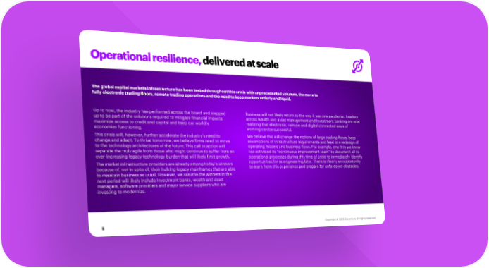 Operational resilience, delivered at scale The global capital markets infrastructure has been tested throughout this crisis with unprecedented volumes, the move to fully electronic trading floors, remote trading operations and the need to keep markets orderly and liquid. Up to now, the industry has performed across the board and stepped Business will not likely return to the way it was pre-pandemic. Leaders up to be part of the solutions required to mitigate financial impacts, across wealth and asset management and investment banking are now maximize access to credit and capital and keep our world’s realizing that electronic, remote and digital connected ways of economies functioning. working can be successful. This crisis will, however, further accelerate the industry’s need to We believe this will change the notions of large trading floors, base change and adapt. To thrive tomorrow, we believe firms need to move assumptions of infrastructure requirements and lead to a redesign of to the technology architectures of the future. This call to action will operating models and business flows. For example, one firm we know separate the truly agile from those who might continue to suffer from an has activated its “continuous improvement team” to document all its ever-increasing legacy technology burden that will likely limit growth. operational processes during this time of crisis to immediately identify opportunities for re-engineering later. There is clearly an opportunity The market infrastructure providers are already among today’s winners to learn from this experience and prepare for unforeseen obstacles. because of, not in spite of, their hulking legacy mainframes that are able to maintain business as usual. However, we assume the winners in the next period will likely include investment banks, wealth and asset managers, software providers and major service suppliers who are investing to modernize. 5