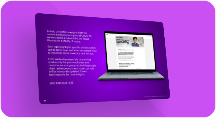 To help our clients navigate both the human and business impact of COVID-19, we’ve created a hub of all of our latest thinking on a variety of topics. Each topic highlights specific actions which can be taken now, and what to consider next as industries move towards a new normal. From leadership essentials to ensuring productivity for your employees and customer service groups to building supply chain resilience and much more, our hub will be constantly updated. Check back regularly for more insights. VISIT OUR HUB HERE 14