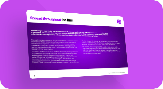 Spread throughoutthe firm Wealth managers, in particular, need to emphasize the human element in this crisis and function as true and trusted advisers to their clients. This requires firms to provide authentic digital engagement, the likely redeployment and retraining of staff at scale, while also ensuring that firms self-assess and meet their fraud, KYC and other compliance priorities. The wealth management sector should appreciate the financial inclusion Radical changes like the new pervasive digital engagement model, and financial literacy components of current actions to ensure equity internally and externally, call for bottom-up adoption with a top-down across all client segments. Nonetheless, the very nature of wealth strategic articulation of the future, with a focus on tomorrow. management (safeguarding client assets) remains unchanged and is For example, new pricing models (e.g. subscription-based wealth perhaps even more critical in today’s environment—players should not advice) and new offerings (e.g. robo-advisory offerings) demand firm- lose sight of their core mission. wide coordination and adoption. Leaders cast shadows and they Successful leaders will leverage this time of instability to not just return ultimately shape tomorrow’s digital and personal engagement models to business as usual but also seize the opportunity for experimentation for clients and employees alike. and innovation. As both clients and employees are anxious and vulnerable, think of offering them something more purposeful to work towards and new solutions. Underpinning this is leadership—part personal, part professional, part a new leadership paradigm—that is balancing today’s planning, tomorrow’s execution and a personal touch. 7