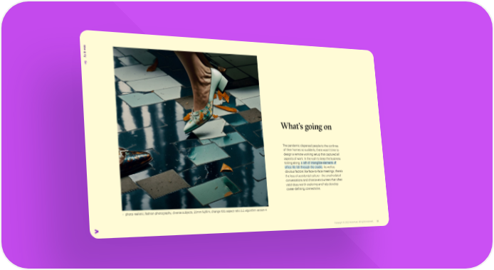 as t w s i A 03 What’s going on The pandemic dispersed people to the confines of their homes so suddenly, there wasn’t time to design a remote working setup that captured all aspects of work. In the rush to keep the business ticking along, a raft of intangible elements of office life fell through the cracks. As well as obvious factors like face-to-face meetings, there’s the loss of accidental culture—the unscheduled conversations and chance encounters that often yield ideas worth exploring and help develop career-defining connections. + photo realistic, fashion photography, diverse subjects, 22mm fujifilm, change 100, aspect ratio 3:2, algorithm version 4 Copyright © 2022 Accenture. All rights reserved. 33