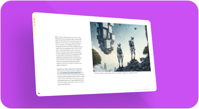 as t w s i A 03 Many cities are thinking about their own unique selling points and looking at ways to attract and retain the best talent from around the world. For instance, Line is a new city in Saudi Arabia that will run entirely on renewable energy and will eventually be home to 9 million residents whose needs will all be reachable within a five-minute 57 Cities have become more community- walk. centric, thinking through traffic by expanding car-free neighborhoods and developing public transportation and bike lanes. Barcelona is addressing spatial planning by creating green 58 hubs that form rural areas in urban jungles. Paris has introduced a dedicated series of “streets to schools” as it looks to make the city 59 safer for children. Leaders now need to decide which approach will serve their business and their employees best. It’s not about just where people work—it’s + futuristic, surrealism, diverse subject, optimistic, 8k, change 100, aspect ratio 3:2, algorithm version 4 how they work, and the value exchange between employer and employee beyond money. In some cases, leaders will need to make clear that what employees want may, in fact, be detrimental to their own experience of work. It’ll be a hard sell, but an important one. Copyright © 2022 Accenture. All rights reserved. 44