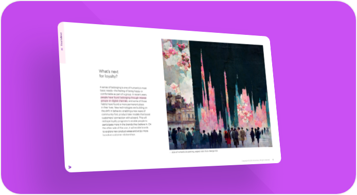 r e v e li e m a b I’ 02 What’s next for loyalty? A sense of belonging is one of humanity’s most basic needs—the feeling of being happy or comfortable as part of a group. In recent years, people have found belonging through interest groups on digital channels, and some of those habits have found a more permanent place in their lives. New technologies are building on the shift in behavior, enabling a new wave of community-first, product-later models that boost customers’ connection with a brand. This will reshape loyalty programs to enable people to participate more in the brands they believe in. On the other side of the coin, it will enable brands to explore new product-areas and enjoy more lucrative customer relationships. + style of romanticist painting, aspect ratio 16:9, change 100 Copyright © 2022 Accenture. All rights reserved. 16