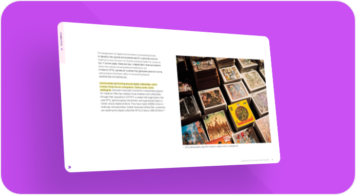 r e v e li e m a b I’ 02 The progression of digital communities is prompting brands to develop new goods and experiences for customers and it’s leading to new revenues for brands and potentially the customer too. In some cases, there are new, independent revenue streams driven by entirely virtual goods (including but not limited to NFTs), perpetual royalties that generate passive income, and products that have utility in virtual and physical experiences simultaneously. Communities are forming around digital collectibles, which include things like art, autographs, trading cards, brand catalogues, and even important moments in news/history/sports. For instance, Nike has created virtual sneakers and collectibles through their acquisition of RTFKT, a creator-led organization that uses NFTs, game engines, blockchain, and augmented reality to create unique digital artifacts. They have made US$185 million in revenues, and secondary market revenues (where their customers 32 are reselling the digital collectible NFTs) of about US$1.29 billion. + 35mm photography, algorithm version 4, aspect ratio 3:2, change 100 Copyright © 2022 Accenture. All rights reserved. 19
