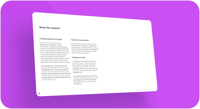 About the research Crowdsourcing from our people Experience Innovation Radar Each year, we ask Accenture Song’s We worked with Accenture Song R&D in Sophia global network of designers, creatives, Antipolis, France, to broaden our perspective of technologists, sociologists, and anthropologists emerging signals using the Experience Innovation to watch out for potentially influential signals and Radar, a proprietary high-frequency signal research trends impacting their communities and countries. process focused on the intersection of human, We run trends workshops throughout July–August technology and business trends. in 40+ locations around the world, then teams pitch their top ideas to the editorial team in Validating our trends August–September. This year, we used an internal online platform and captured over 450 unique We validated our trends themes externally in signals across other Accenture Song communities. two steps. First, we ran online focus groups in We processed nearly 4,000 sentences of text seven markets (UK, US, Brazil, China, France, and audio data and fed them into our NLP topic South Africa, and India) with a total of 587 modeling algorithm. This algorithm created 40+ participants. Secondly, we ran an online survey key topics from the trends conversations, which across 20 countries with 14,500 participants in were then used to accelerate and inform the trend December 2022. synthesis process. From there, the editorial team Once the trends were refined, we put them to worked together to further synthesize, shape, and the test with Accenture’s own experts in Talent refine the trends report. and Organization, Commerce, Technology, Sustainability, Research and Development, among others. Copyright © 2022 Accenture. All rights reserved. 77