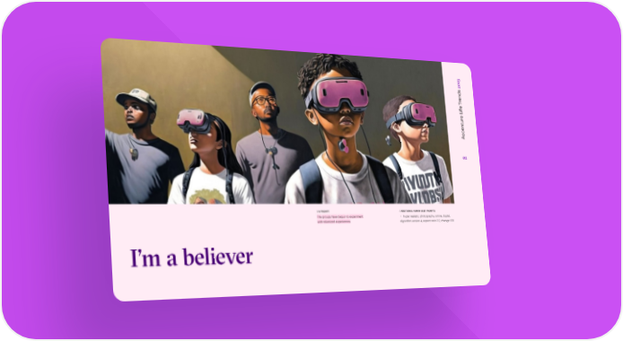 23 20 ds en r T e f i L e r u t en c c A 02 / AI PROMPT / ADDITIONAL HUMAN USER PROMPTS The groups have begun to experiment + hyper realistic, photography, online, digital, with tokenized experiences algorithm version 4, aspect ratio 3:2, change 100 I’m a believer