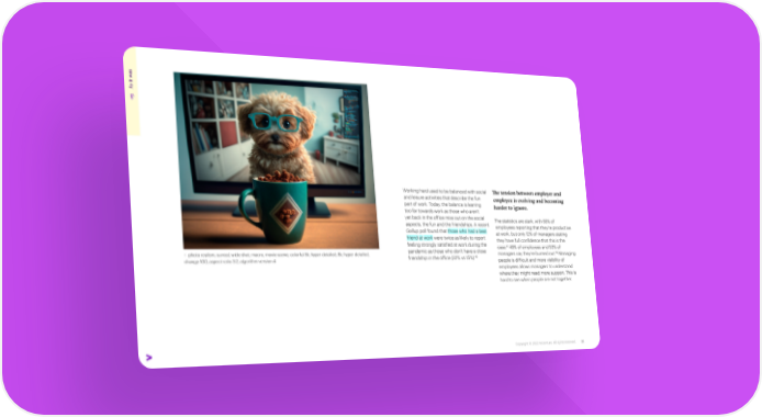 as t w s i A 03 Working hard used to be balanced with social The tension between employer and and leisure activities that describe the fun employee is evolving and becoming part of work. Today, the balance is leaning harder to ignore. too far towards work as those who aren’t yet back in the office miss out on the social The statistics are stark, with 85% of aspects, the fun and the friendships. A recent employees reporting that they’re productive Gallup poll found that those who had a best at work, but only 12% of managers stating friend at work were twice as likely to report they have full confidence that this is the feeling strongly satisfied at work during the 47 pandemic as those who don’t have a close case. 48% of employees and 53% of 48 + photo realism, surreal, wide shot, macro, movie scene, colorful 8k, hyper detailed, 8k, hyper detailed, 46 managers say they’re burned out. Managing change 100, aspect ratio 3:2, algorithm version 4 friendship in the office (32% vs 15%). people is difficult and more visibility of employees allows managers to understand where they might need more support. This is hard to see when people are not together. Copyright © 2022 Accenture. All rights reserved. 35