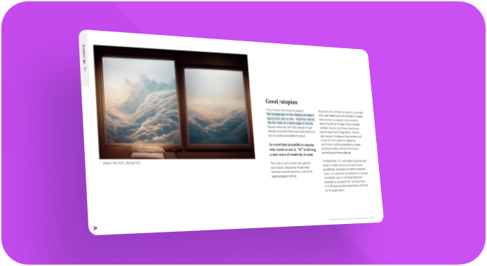 ty vi i t ea r K, C O   04 Good/utopian First, there’s the creativity aspect. Second is the efficiency aspect, as people The hardest part of the creative process is who use these tools will be able to create going from zero to one—meaning making new content at speed. Until recently, the first mark on a blank page or canvas. searching for an image online yielded Neural networks will help people to get variable results, but those results are started, and then they can build layers on becoming more imaginative. There’s top to produce excellent output. also reason to believe that content will move on from static to adaptive, As a tool that accessible to anyone such that it will be possible to create who wants to use it, “AI” is driving programmable content that flexes a new wave of creativity at scale. according to the audience. + aspect ratio 16:9, change 100 The output will include new genres Furthermore, “AI” will make it quicker and such as art, electronic music that easier to align content to brand style reaches new dimensions, and more guidelines, and even to react to events, sophisticated writing. news, or customer complaints in a brand- compliant way. It will likely become possible to program “AI” to know how to craft appropriate responses with little or no supervision. Copyright © 2022 Accenture. All rights reserved. 54