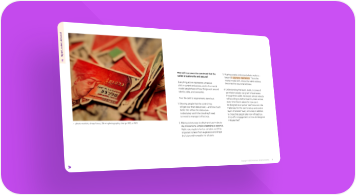 d e r e v li e d, d e eal d, s e gn i S 05 How will customers be convinced that the 3. Helping people understand what a wallet is— wallet is trustworthy and secure? beyond a payment mechanism. This is the mental model shift, where the wallet address Everything above represents a massive becomes the new email address. shift in control and access, and in the mental model people have of how things work around 4. Understanding the layers, levels, or zones of identity, data, and ownership. permission people can grant to businesses through their wallet. We expect almost nobody Four life-centric requirements stand out: will be willing to define token-by-token access every time they’re asked. So how can it 1. Showing people that the control they be designed as a quicker task? How can it be will get over their data privacy—and how much made easy for the user to set up and control better this is than the status quo— layers of access? Every extra step in addition is absolutely worth the time they’ll need to those that people take now will lead to a to invest to manage it effectively. drop-off in engagement, so how do designers mitigate that? + photo realistic, sharp focus, 35mm photography, change 100, ar 16:9 2. Making tokens easy to obtain and use in day-to- day transactions. Simple onboarding is essential. Right now, crypto is far too complex, so it’ll be important to learn from experience and shape the future with empathy for all users. Copyright © 2022 Accenture. All rights reserved. 71