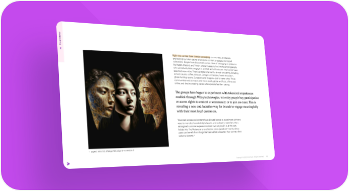 r e v e li e m a b I’ 02 Right now, we see three threads converging: communities of interests and belonging, token-gating of exclusive content or access, and digital collectibles. People have discovered communities of belonging on platforms like Reddit, Discord, and Twitch, where it’s easy to find kinship among people who will actively listen, engage in, and talk about the topics they had perhaps assumed were niche. There’s a digital channel for almost everything, including activist causes, coffee, skincare, vintage synthesizers, home renovation, ghost-hunting, sports, Dungeons and Dragons—just to name a few. These communities exist at macro and micro levels, global and local, offline and online, and they’re creating places where people feel they belong. The groups have begun to experiment with tokenized experiences enabled through Web3 technologies, whereby people buy participation or access rights to content or community, or to join an event. This is revealing a new and lucrative way for brands to engage meaningfully with their most loyal customers. Tokenized access and content have allowed brands to experiment with new ways to monetize branded digital assets, and is allowing superfans into a reimagined customer experience where two-way loyalty is at the core. Adidas Into The Metaverse is an effective token-gated community, where users can benefit from things like free Adidas products if they connect their 31 wallet to Discord. + aspect ratio 3:2, change 100, algorithm version 4 Copyright © 2022 Accenture. All rights reserved. 18