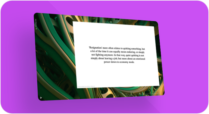 e v rvi u ll s 1 I wi 0 ‘Resignation’ more often relates to quitting something, but a lot of the time it can equally mean enduring, or simply not fighting anymore. In that way, quiet quitting is not simply about leaving a job, but more about an emotional power-down to economy mode. Image created using artificial intelligence Copyright © 2022 Accenture. All rights reserved. 12