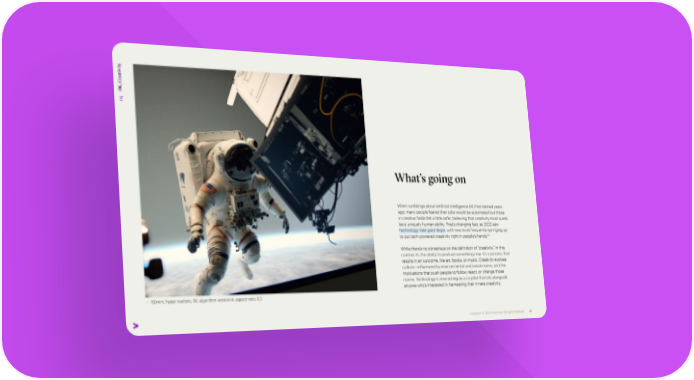 ty vi i t ea r K, C O 04 What’s going on When rumblings about artificial intelligence (AI) first started years ago, many people feared their jobs would be automated but those in creative fields felt a little safer, believing that creativity must surely be a uniquely human ability. That’s changing fast, as 2022 saw technology take giant leaps, with new tools frequently springing up 60 to put tech-powered creativity right in people’s hands. While there’s no consensus on the definition of “creativity,” in this context it’s the ability to produce something new. It’s a process that results in an outcome, like art, books, or music. Creativity evolves culture—influenced by environmental and social norms, and the motivations that push people to follow, reject, or change those norms. Technology is now acting as a co-pilot that sits alongside anyone who’s interested in harnessing their innate creativity. + 50mm, hyper realistic, 8k, algorithm version 4, aspect ratio 3:2 Copyright © 2022 Accenture. All rights reserved. 47