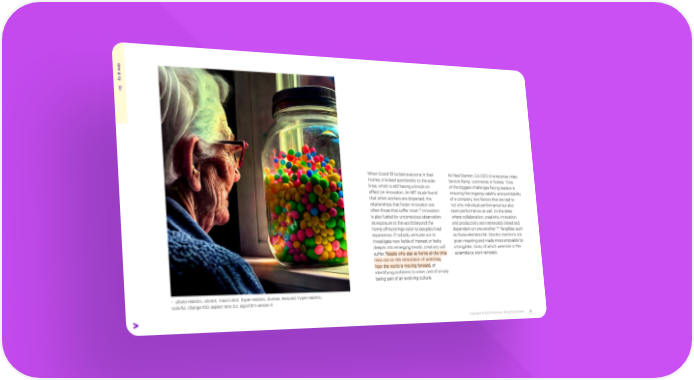as t w s i A 03 When Covid-19 locked everyone in their As Neal Stanton, Co-CEO of enterprise video homes, it kicked spontaneity to the side- service Ramp, comments in Forbes: “One lines, which is still having a knock-on of the biggest challenges facing leaders is effect on innovation. An MIT study found ensuring the ongoing viability and profitability that when workers are dispersed, the of a company, two factors that are tied to relationships that foster innovation are not only individual performance but also 53 often those that suffer most. Innovation team performance as well. It’s the latter is also fueled by unconscious observation, where collaboration, creativity, innovation as exposure to the world beyond the and productivity are irretrievably linked and home office brings color to people’s lived 54 Tangibles such dependent on one another.” experience. If nobody ventures out to as those elements Mr. Stanton mentions are investigate new fields of interest or looks given meaning and made more enjoyable by deeper into emerging trends, creativity will intangibles, many of which were lost in the suffer. People who stay at home all the time scramble to work remotely. miss out on the stimulation of watching how the world is moving forward, of identifying problems to solve, and of simply being part of an evolving culture. + photo-realistic, vibrant, macro shot, hyper-realistic, diverse, textured, hyper-realistic, colorful, change 100, aspect ratio 3:2, algorithm version 4 Copyright © 2022 Accenture. All rights reserved. 39