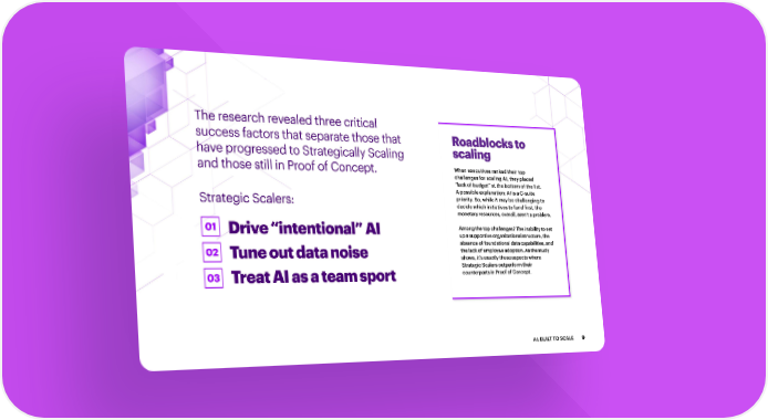 The research revealed three critical success factors that separate those that Roadblocks to have progressed to Strategically Scaling scaling and those still in Proof of Concept. When executives ranked their top challenges for scaling AI, they placed “lack of budget” at the bottom of the list. A possible explanation: AI is a C-suite Strategic Scalers: priority. So, while it may be challenging to decide which initiatives to fund first, the monetary resources, overall, aren’t a problem. 01 Drive “intentional” AI Among the top challenges? The inability to set up a supportive organizational structure, the absence of foundational data capabilities, and 02 Tune out data noise the lack of employee adoption. As the study shows, it’s exactly these aspects where Strategic Scalers outperform their 03 Treat AI as a team sport counterparts in Proof of Concept. AI: BUILT TO SCALE 9