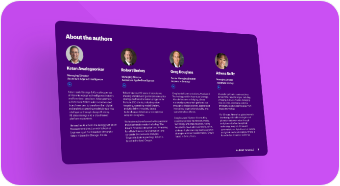 About the authors Ketan Awalegaonkar Robert Berkey Greg Douglass Athena Reilly Managing Director Managing Director Senior Managing Director Managing Director Accenture Applied Intelligence Accenture Applied Intelligence Accenture Strategy Accenture Strategy Ketan leads Strategy & Consulting across Robert has over 20 years of experience Greg leads Communications, Media and Athena helps C-suite leaders address all Accenture Applied Intelligence industry shaping and delivering enterprise analytics Technology within Accenture Strategy. some of their top challenges, including and functional practices. Ketan partners strategy and transformation programs for His role focuses on helping clients changing business models, managing with Fortune 500 C-suite executives and Fortune 500 clients, including value worldwide achieve high performance data volumes, addressing analytics board members to transform their digital targeting, operating model & talent, through profitable growth, accelerated immaturity and transitioning away from and analytics operating models by applying analytic delivery models, data & innovation, organizational agility, and legacy technology. intelligence through design-thinking, technology architecture and employee operational excellence. AI, data strategy and a cloud-based adoption programs. For 20 years, Athena has guided teams in platform ecosystem. Greg has over 25 years of consulting developing actionable strategies and He has co-authored several white papers on experience across the telecom, media, plans to create more value through He teaches AI at both the Kellogg School of analytics transformation including “The technology and retail industries, having analytics and define the optimal Management & McCormick School of Insight-Powered Enterprise” and “Preparing focused on new digital business launches, technology footprint. A frequent Engineering at Northwestern University. for a Data Science Transformation”, and strategic digital planning, business growth commentator on digital trends in national Ketan in based in Chicago, Illinois. co-created Accenture’s Analytics strategies and cost transformation. Greg is and global media publications, Athena is Diagnostic (patent pending). Robert is based in Dallas, Texas. based in San Francisco, California. based in Portland, Oregon. AI: BUILT TO SCALE 2