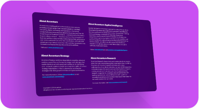 About Accenture About Accenture Applied Intelligence Accenture is a leading global professional services company, Applied Intelligence is Accenture’s approach to scaling AI for our clients. providing a broad range of services and solutions in strategy, We embed AI-powered data, analytics and automation capabilities into consulting, digital, technology and operations. Combining business workflows to accelerate time to value. Our expertise in defining unmatched experience and specialized skills across more than 40 end-to-end strategy, combined with deep data infrastructure industries and all business functions — underpinned by the world’s capabilities, cognitive services and industrialized accelerators help largest delivery network — Accenture works at the intersection of smooth clients’ path to AI adoption, extending human capabilities and business and technology to help clients improve their performance supporting clients in scaling AI responsibly. Recognized as a leader by and create sustainable value for their stakeholders. With 482,000 industry analysts, we collaborate with a powerful global alliance, people serving clients in more than 120 countries, Accenture drives innovation and delivery network to help clients deploy and scale AI innovation to improve the way the world works and lives. within any market and industry. Visit us at www.accenture.com Follow @AccentureAI and visit accenture.com/appliedintelligence About Accenture Strategy About Accenture Research Accenture Strategy combines deep industry expertise, advanced Accenture Research shapes trends and creates data-driven insights analytics capabilities and human-led design methodologies that about the most pressing issues global organizations face. Combining enable clients to act with speed and confidence. By identifying the power of innovative research techniques with a deep clear, actionable paths to accelerate competitive agility, Accenture understanding of our clients’ industries, our team of 300 researchers Strategy helps leaders in the C-suite envision and execute and analysts spans 20 countries and publishes hundreds of reports, strategies that drive growth in the face of digital transformation. articles and points of view every year. Our thought-provoking For more information, follow @AccentureStrat or visit research—supported by proprietary data and partnerships with www.accenture.com/strategy leading organizations, such as MIT and Harvard— guides our innovations and allows us to transform theories and fresh ideas into real-world solutions for our clients. For more information, visit www.accenture.com/research Copyright © 2019 Accenture. All rights reserved. Accenture and its logo are registered trademarks of Accenture.