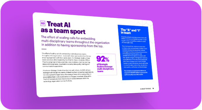03 Treat AI The “A” and “I” as a team sport in team A leading global convenience store chain with The effort of scaling calls for embedding $60B in revenue and 16,000 locations sought to gain a more competitive position to stave multi-disciplinary teams throughout the organization off more agile rivals. in addition to having sponsorship from the top. They leveraged data science to price their products more competitively to better match customer demand across global markets. Leveraged machine learning and automation The effort of scaling calls for embedding multi-disciplinary teams to increase pricing frequency. And throughout the organization—teams with clear sponsorship from the top established virtual agents to interact with ensuring alignment with the C-suite vision. For Strategic Scalers, these their global category management teams to teams are most often headed by the Chief AI, Data or Analytics Officer. 92% drive adoption of the new pricing approach. They’re comprised of data scientists; data modelers; machine learning, All of these changes were made possible data and AI engineers; visualization experts; data quality, training and of Strategic thanks to multi-disciplinary teams with skills communications specialists. Scalers leverage in areas like data engineering, visualization, multi-disciplinary data quality, and human-centered design. It’s a lesson Strategic Scalers have learned well. In fact, a full 92% of them teams The initiative is expected to deliver an leverage multi-disciplinary teams. Embedding them across the organization is expected US$300 million in gross profit not only a powerful signal about the strategic intent of the scaling effort, it uplift annually once fully scaled. also enables faster culture and behavior changes. In contrast, those still in Proof of Concept are more likely to rely on a lone champion within the technology organization to drive AI efforts. AI: BUILT TO SCALE 15