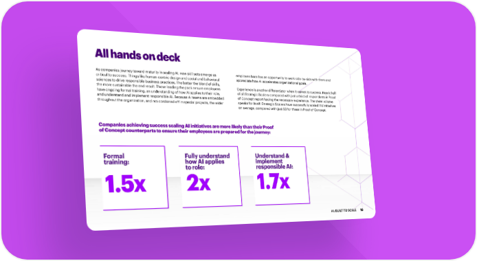 All hands on deck As companies journey toward maturity in scaling AI, new skill sets emerge as employee base has an opportunity to work side-by-side with them and critical to success. Things like human-centric design and social and behavioral appreciate how AI accelerates organizational goals. sciences to drive responsible business practices. The better the blend of skills, the more sustainable the end result. Those leading the pack ensure employees Experience is another differentiator when it comes to success. Nearly half have ongoing formal training, an understanding of how AI applies to their role, of all Strategic Scalers compared with just a third of respondents in Proof and understand and implement responsible AI. Because AI teams are embedded of Concept report having the necessary experience. The sheer volume throughout the organization, and not cordoned off in special projects, the wider speaks for itself: Strategic Scalers have successfully scaled 114 initiatives on average, compared with just 53 for those in Proof of Concept. Companies achieving success scaling AI initiatives are more likely than their Proof of Concept counterparts to ensure their employees are prepared for the journey: Formal Fully understand Understand & training: how AI applies implement 1.5x to role: responsible AI: 2x 1.7x AI: BUILT TO SCALE 16