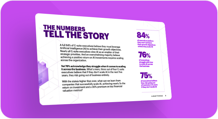 THE NUMBERS 84% TELL THE STORY of executives believe they won’t achieve their growth objectives A full 84% of C-suite executives believe they must leverage unless they scale AI Artificial Intelligence (AI) to achieve their growth objectives. Nearly all C-suite executives view AI as an enabler of their strategic priorities. And an overwhelming majority believe 76% achieving a positive return on AI investments requires scaling of executives across the organization. struggle with how to scale AI across Yet 76% acknowledge they struggle when it comes to scaling the business it across the business. What’s more, three out of four C-suite executives believe that if they don’t scale AI in the next five years, they risk going out of business entirely. 75% With the stakes higher than ever, what can we learn from of executives believe companies that successfully scale AI, achieving nearly 3x the they risk going out return on investment and a 30% premium on key financial of business in 5 years valuation metrics? if they don’t scale AI AI: BUILT TO SCALE 3