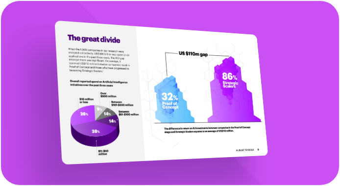 The great divide When the 1,500 companies in our research were US $110m gap analyzed collectively, US$306 billion was spent on AI applications in the past three years. The ROI gap amongst them was significant. On average, it spanned US$110 million between companies stuck in Proof of Concept and those who have progressed to 1 becoming Strategic Scalers. 86% Strategic Overall reported spend on Artificial Intelligence Scalers initiatives over the past three years Over $500 million 32% $10 million Between or less $101-$500 million Proof of 9% Concept 26% 14% Between $51-$100 million 14% 38% The difference in return on AI investments between companies in the Proof of Concept stage and Strategic Scalers equates to an average of US$110 million. $11-$50 million AI: BUILT TO SCALE 6