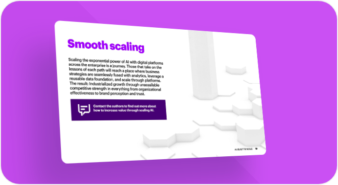 Smooth scaling Scaling the exponential power of AI with digital platforms across the enterprise is a journey. Those that take on the lessons of each path will reach a place where business strategies are seamlessly fused with analytics, leverage a reusable data foundation, and scale through platforms. The result: Industrialized growth through unassailable competitive strength in everything from organizational effectiveness to brand perception and trust. Contact the authors to find out more about how to increase value through scaling AI. AI: BUILT TO SCALE 19