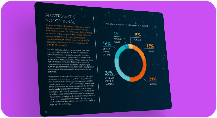 AI OVERSIGHT IS NOT OPTIONAL How often are outputs from AI reviewed or evaluated? Despite widespread messages in popular media that suggest that AI operates independent of human intervention, those responsible for putting 4% 5% AI to work in their organizations across industries recognize that these technologies require ALMOST HOURLY rigorous oversight. In fact, nearly a quarter (23 NEVER percent) of AI adopters review or evaluate AI 16% 18% outputs at least daily. ONCE/ DAILY The data also suggests that companies that have been TWICE more successful with AI tend to have more rigorous A YEAR oversight processes in place. For example, 74 percent of successful companies report that they review their AI output at least weekly, compared with 33 percent of those that are less successful. And 43 percent of successful companies have a process in place for augmenting or overriding questionable results, compared with 28 percent of companies that haven’t yet found success in their AI initiatives. 26% Many believe that despite these positive signs, oversight processes have a long way to go before they catch up AT LEAST 31% with advances in AI technology. “Although we are still in ONCE A the very early phases of AI, the technology is already well MONTH ahead of the marketplace when it comes to the processes WEEKLY and procedures organizations have in place to provide oversight,” says Oliver Schabenberger. “For example, we would be seeing more widespread use of driverless cars if government oversight and automaker-level governance capabilities were able to keep up with the technology itself. The technical capabilities are ahead of our ability to cope with the technology.” 14