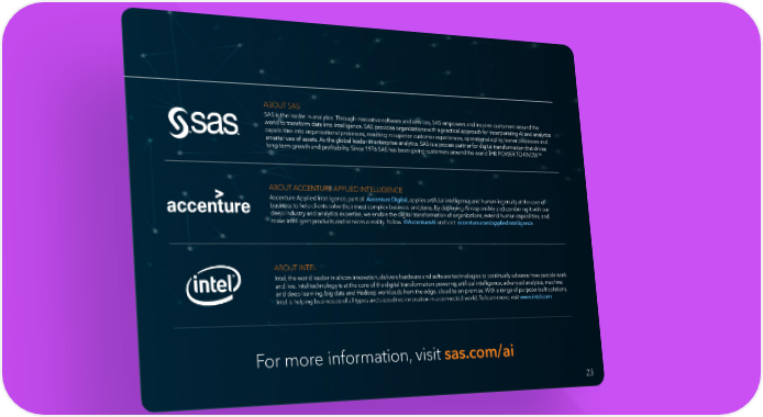 ABOUT SAS SAS is the leader in analytics. Through innovative software and services, SAS empowers and inspires customers around the world to transform data into intelligence. SAS provides organizations with a practical approach for incorporating AI and analytics capabilities into organizational processes, resulting in superior customer experiences, operational agility, leaner processes and smarter use of assets. As the global leader in enterprise analytics, SAS is a proven partner for digital transformation that drives long-term growth and profitability. Since 1976 SAS has been giving customers around the world THE POWER TO KNOW.® ABOUT ACCENTURE APPLIED INTELLIGENCE Accenture Applied Intelligence, part of Accenture Digital, applies artificial intelligence and human ingenuity at the core of business to help clients solve their most complex business problems. By deploying AI responsibly and combining it with our deep industry and analytics expertise, we enable the digital transformation of organizations, extend human capabilities, and make intelligent products and services a reality. Follow @AccentureAI and visit accenture.com/appliedintelligence. ABOUT INTEL Intel, the world leader in silicon innovation, delivers hardware and software technologies to continually advance how people work and live. Intel technology is at the core of the digital transformation powering artificial intelligence, advanced analytics, machine and deep learning, big data and Hadoop workloads from the edge, cloud to on-premise. With a range of purpose-built solutions, Intel is helping businesses of all types and sizes drive innovation in a connected world. To learn more, visit www.intel.com For more information, visit sas.com/ai 23